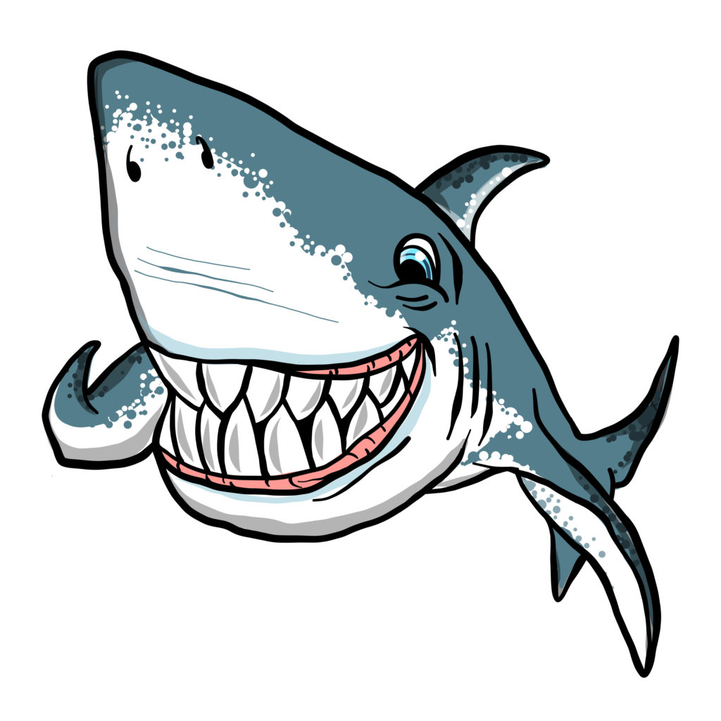 EN: A fearsome-looking great white shark with a broad grin, baring its teeth, but which is actually friendly and gentle.