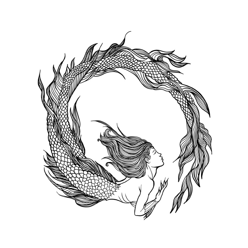 EN: An elegant mermaid is captured in a flowing line drawing, her form graceful and minimal. Clean, smooth curves create a timeless, refined design—perfect for a stylish and understated merch piece.